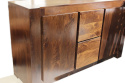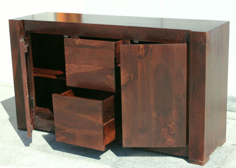 Ten mebel został wykonany z wysokiej jakości drewna mango, w kolorze ciepłego brązu. Faktura egzotycznego drewna sprawia, że mimo swojej prostej formy, jest bardzo oryginalna. Ta piękna komoda, to niezwykle pojemny i praktyczny mebel. Posiada dwie pojemne głębokie szuflady, które pomieszczą wiele ubrań, dokumentów lub innych przedmiotów oraz dwie szafki z półkami.