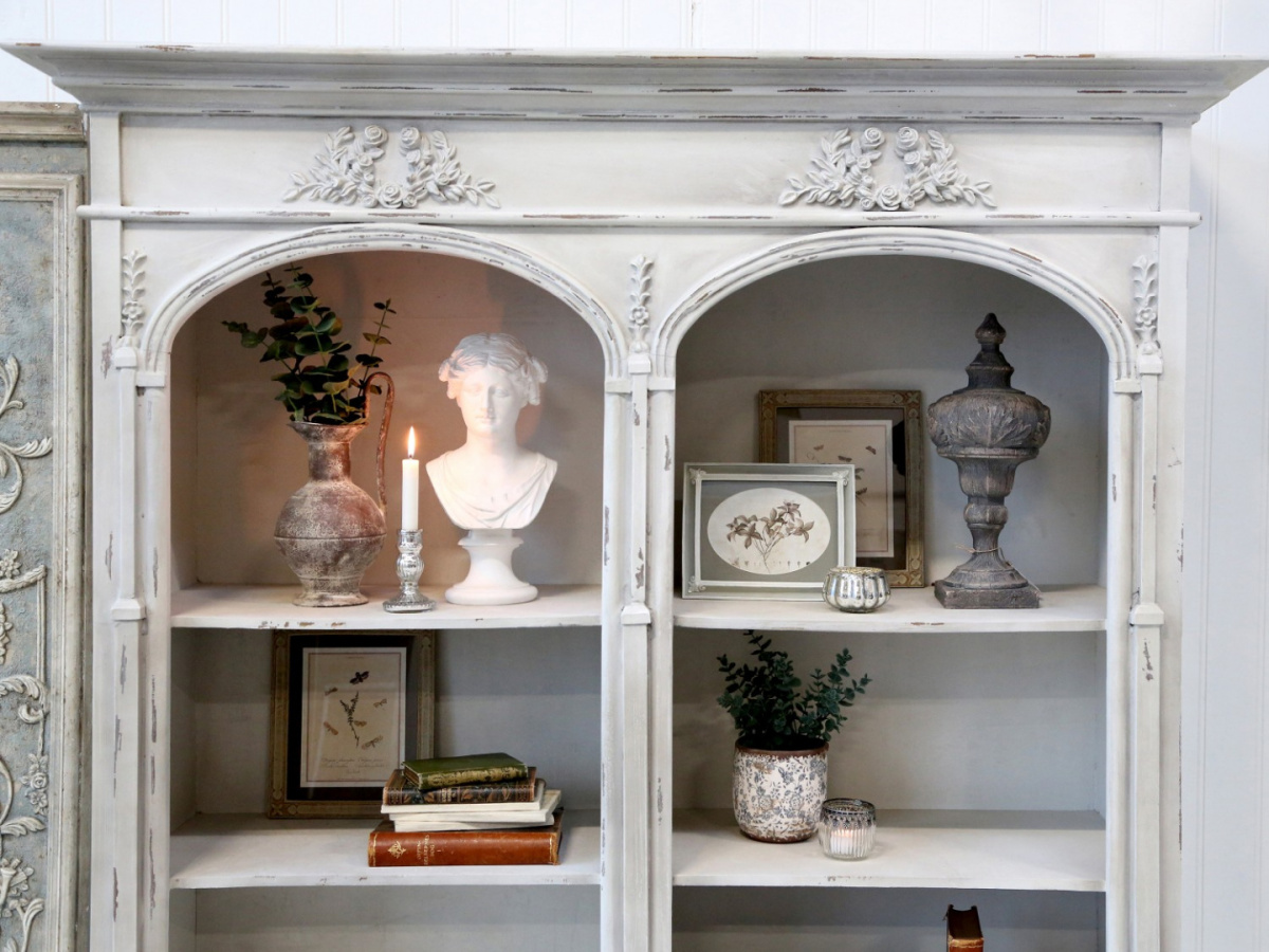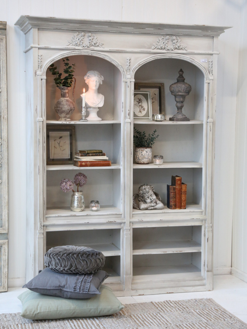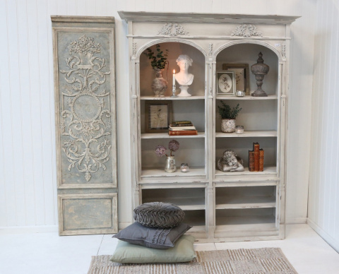 Wysoki, przecierany regał / biblioteka w stylu prowansalskim, stworzony przez projektantów marki Chic Antique.