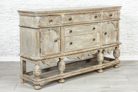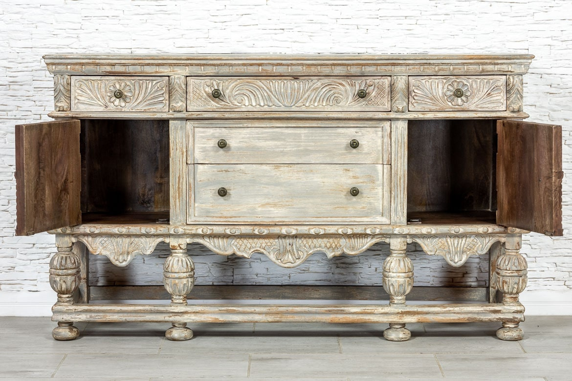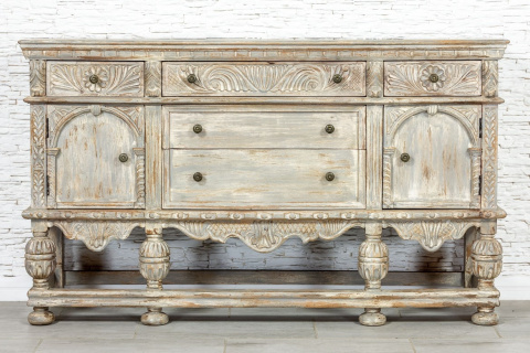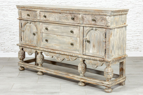 Wybarwiona na odcień jasnej szarości z prześwitami do kremu i naturalnego drewna. Mebel posiada przepiękne, rzeźbione fronty, które kryją za sobą pokaźną przestrzeń do przechowywania,. Ma dwa spore schowki, a także pięć szuflad różnej wielkości. Komodę osadzono na strojnej, masywnej podstawie, która nawiązuje do stylu z dawnych lat. Zachwyca zarówno stylem jak i funkcjonalnością. Ozdobi przestronny salon w orientalnym wnętrzu lub hall w indyjskiej restauracji.