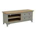 Szafka ma jasny drewniany blat, a korpus w kolorze szarym przecieranym. Mebel posiada dwie pojemne szuflady ze stylowymi ozdobnymi metalowymi uchwytami, oraz dwie otwarte półki na sprzęt RTV. Styl prowansalski we wnętrzach jest wciąż popularny i nie zapowiada się żeby wyszedł z mody. Kojarzony ze słońcem, zapachem lawendy i wakacyjnym klimatem, styl prowansalski daje we wnętrzach poczucie swobody i relaksu.