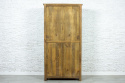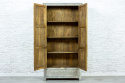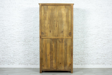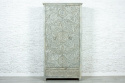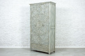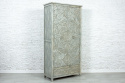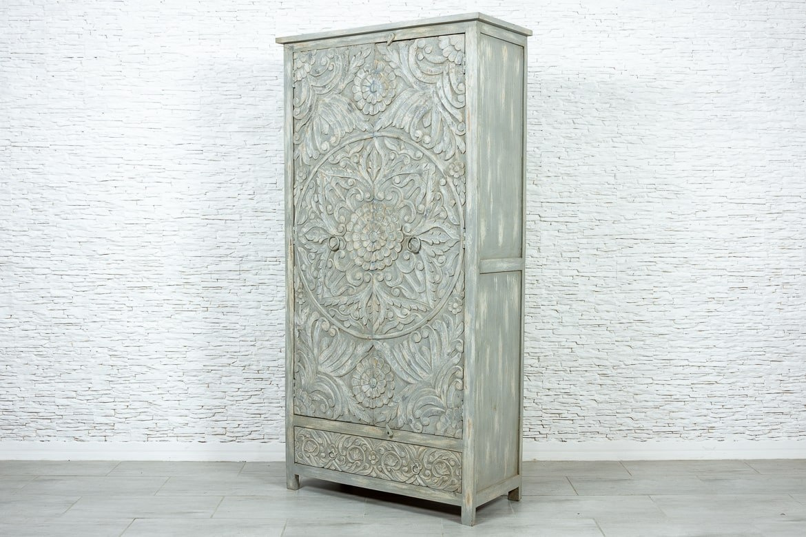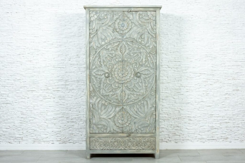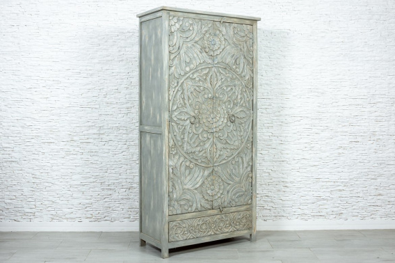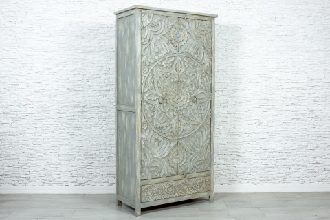 Wysoka, orientalna, postarzana szafa dwudrzwiowa z dekoracyjnym frontem wyrzeźbionym na bazie kształtu mandali. Ten okazały mebel został wykonany ręcznie przez indyjskich rzemieślników z drewna mango. Powierzchnia została specjalnie postarzona i przetarta, dzięki czemu spod kolejnych warstw wyłaniają się inne odcienie szarości, a niekiedy naturalny kolor drewna. Wewnątrz szafy znajdują się trzy pojemne półki, na dole jedna szeroka szuflada. Ozdobne uchwyty nadają meblowi charakteru vintage. Mebel odnajdzie się w każdym pomieszczeniu. Polecamy do wnętrz inspirowanych orientem.