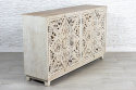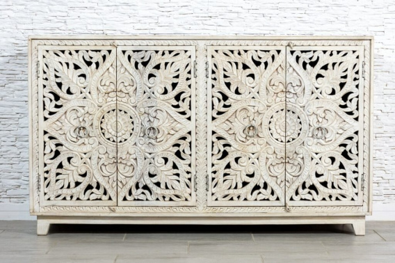 Duża, biała komoda indyjska z drewna mango. Mebel posiada przepiękne, rzeźbione florystycznie, ażurowe fronty, które kryją za sobą pokaźną przestrzeń do przechowywania. Komoda zachwyca zarówno stylem jak i funkcjonalnością. Ozdobi przestronny salon w orientalnym wnętrzu lub hall w indyjskiej restauracji.