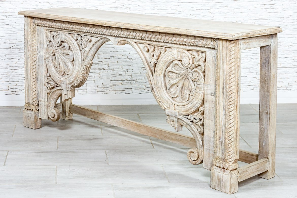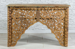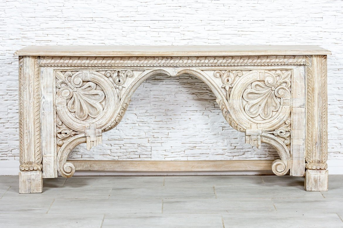 Bogato rzeźbiona konsola indyjska z dekoracyjnym łukiem, wykonana bielonego drewna mango. Mebel wyjątkowo ozdobny, urozmaicony delikatnymi przetarciami. Odnajdzie się szczególnie w przestronnym salonie lub przedpokoju. Konsola o orientalnym, wysmakowanym designie, który doskonale wpisze się w stylizacje inspirowane Indiami, a także kolonialne i rustykalne. Będzie także ciekawym przełamaniem innych aranżacji.