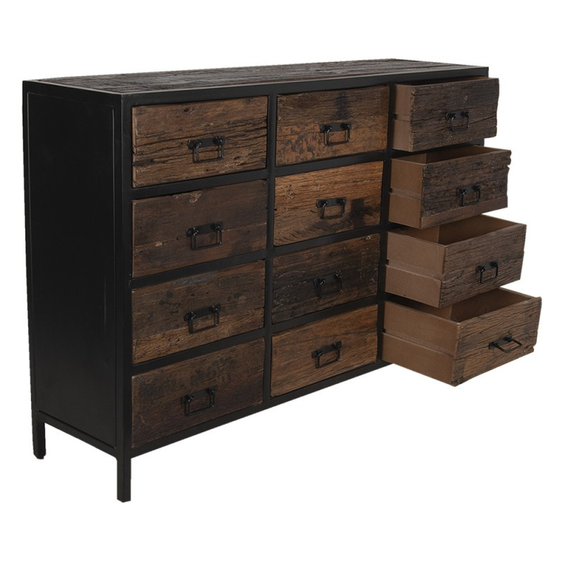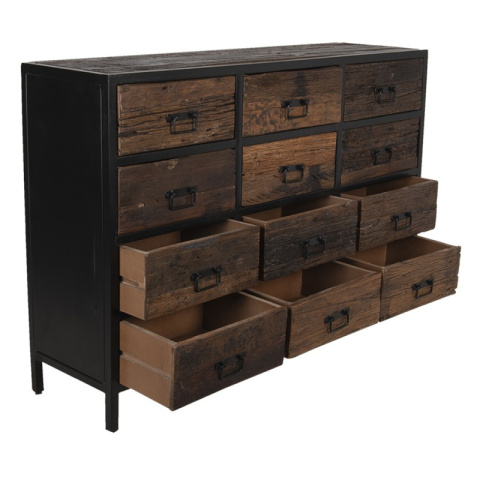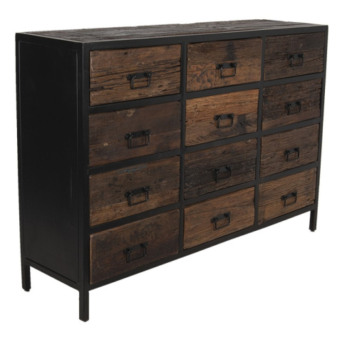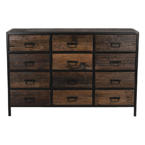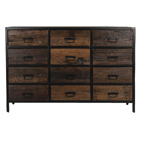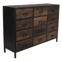 Mebel został wykonany z mocno szczotkowanego, postarzonego drewna i metalu. Komoda , bieliźniarka posiada dwanaście szuflad z minimalistycznymi uchwytami. Jest bardzo funkcjonalna i bez problemu posegregujesz w niej wszelkiego rodzaju przedmioty. Jest dobrym rozwiązaniem do każdego pomieszczenia i tylko od Twojej wyobraźni zależy jej zastosowanie. Komoda sprawdzi się w stylizacjach loft/industrial, country a także skandynawskich.