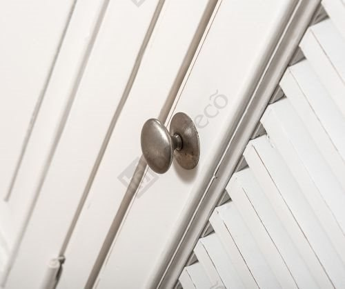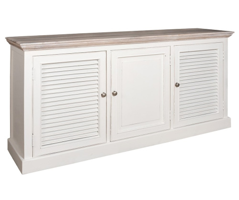 Posiada trzy zamykane szafki z półkami, z których dwie posiadają drzwiczki wyglądem przypominające drewniane żaluzje okienne. Komoda pomieści wiele przedmiotów i pozwoli Ci utrzymać nienaganny porządek w pięknie zaaranżowanej przestrzeni.