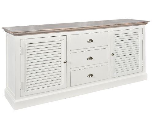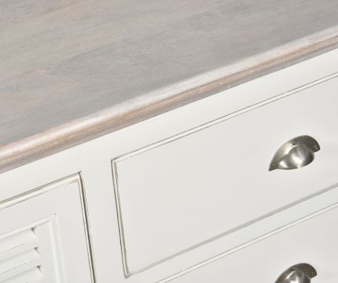 Korpus mebla w kolorze antycznej bieli stanowi drewno akacjowe obite płytą mdf. Płyta jest umieszczona również na tylnej części mebla. Drzwiczki oraz szuflady wykonano z drewna mango. Charakter mebla podkreślają delikatne przetarcia na drzwiczkach. Żaluzjowe drzwiczki tzw. shuttersy nawiązują do stylu nadmorskich wnętrz w Hamptons. Komoda pomieści wiele przedmiotów i pozwoli Ci utrzymać nienaganny porządek w pięknie zaaranżowanej przestrzeni.