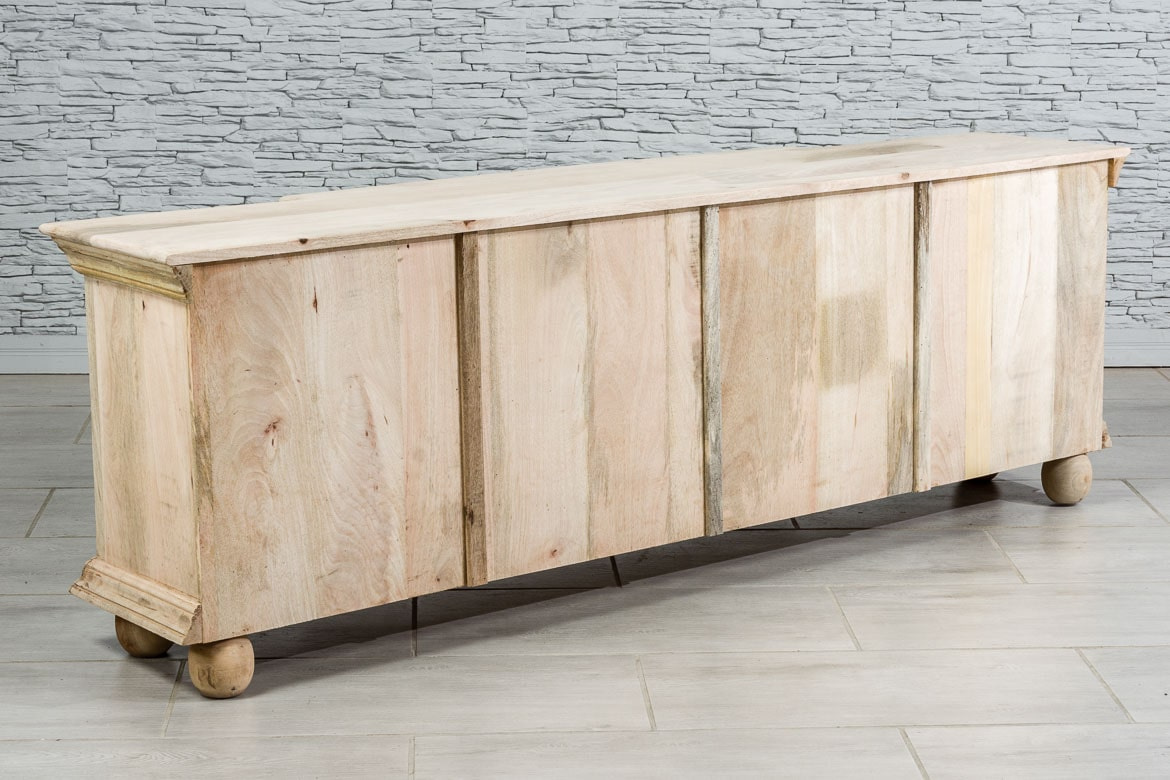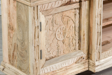 Szeroka, indyjska szafka RTV rzeźbiona w mandale, wykonana z surowego drewna mango.