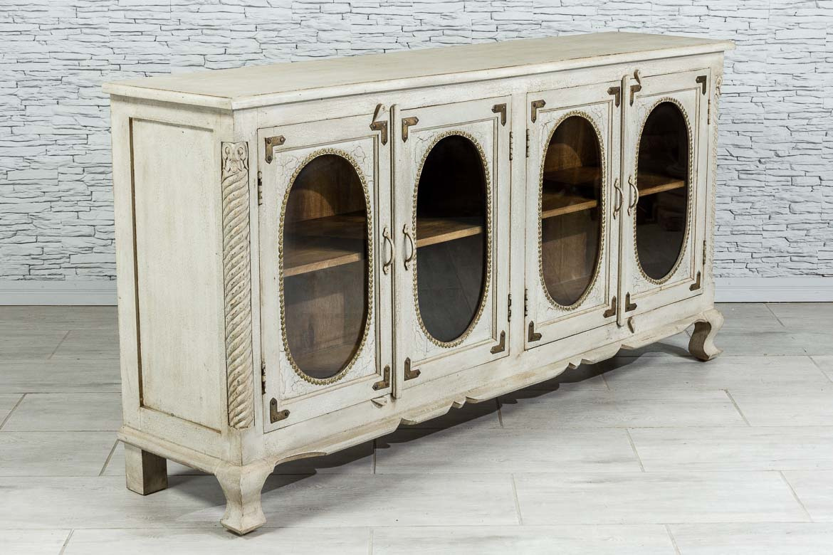 Komoda wykonana w Indiach z drewna mango oraz malowana z efektem crackle paint. Mebel posiada przepiękne, dekoracyjne fronty z owalnymi przeszkleniami, które kryją za sobą pokaźną przestrzeń do przechowywania. Komoda zachwyca zarówno stylem jak i funkcjonalnością. Ozdobi przestronny salon w orientalnym wnętrzu lub hall w indyjskiej restauracji. Polecamy łączyć z produktami takimi jak: Indyjska witryna, lustro w drewnianej ramie, stół w stylu kolonialnym.