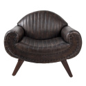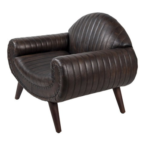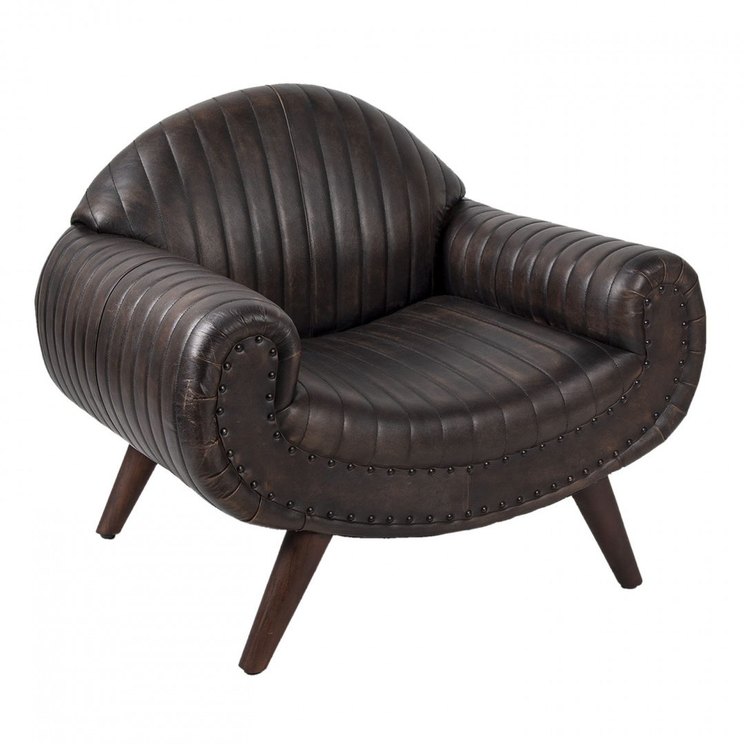 Designerski, skórzany fotel na drewnianych nogach w odcieniu czekoladowego brązu.