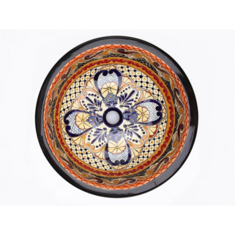 Okrągła umywalka wpuszczana z Meksyku. Wszystkie umywalki są malowane ręcznie przez meksykańskiego artystę, więc każda umywalka stanowi unikalne dzieło sztuki użytkowej. Piękna i niesamowicie barwna, oparta na wzornictwie meksykańskim, w intensywnych ciepłych kolorach. Okrągła umywalka wpuszczana, tworzy z blatem jeden element dekoracyjny, a jednocześnie użytkowy. Dzięki temu stwarza poczucie harmonii i elegancji. Umywalki wpuszczane są wygodne, praktyczne w użyciu i łatwe w utrzymaniu czystości.