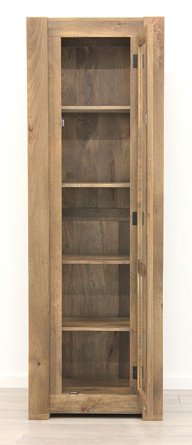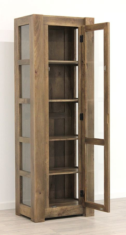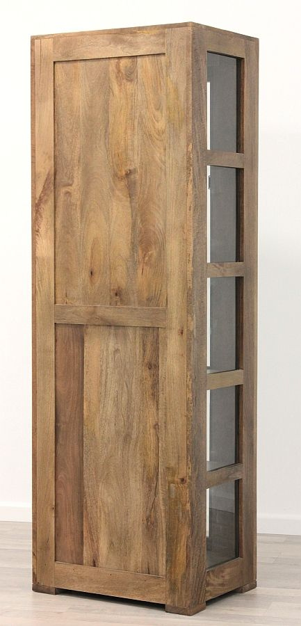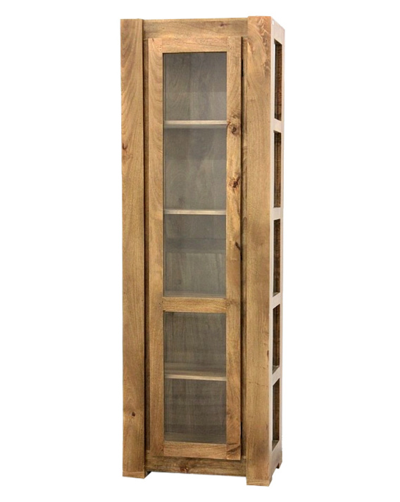 Wysoka witryna, wykonana z drewna mangowca indyjskiego w kolorze toffi.
