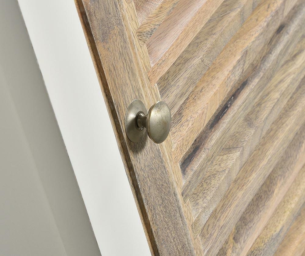 Mebel wykończony w stylu hampton, wybarwiony na odcień antycznej bieli, w zestawieniu z jasnym drewnem. Ten niezwykły regał zachwyca stylem, jakością wykonania i funkcjonalnością. Wysokiej klasy surowce, których użyto do jego produkcji sprawiają, że robi ona niezwykłe wrażenie. Jest dopracowany w każdym calu. Posiada schowek z półką za ażurowym frontem typu shutters, a w górnej części witrynkę z półkami.