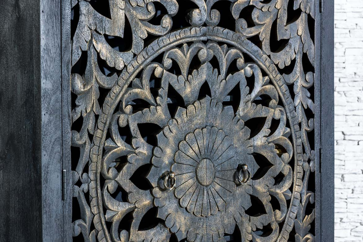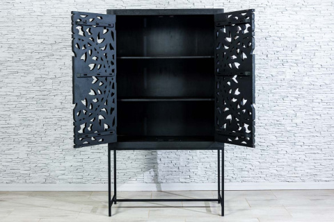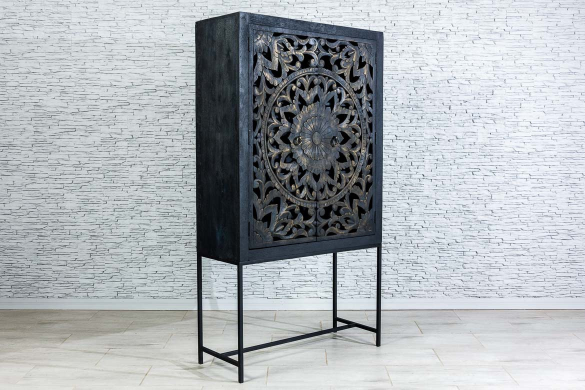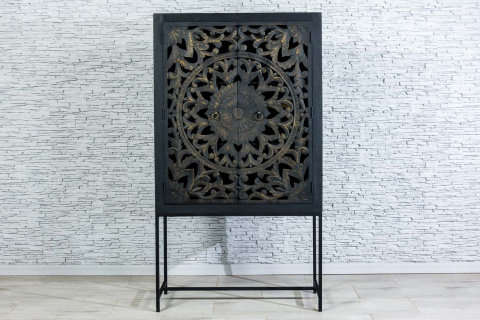 Szafkę wykonano w małej, indyjskiej manufakturze z egzotycznego drewna mango. Powierzchnia drewna została wypiaskowana tworząc efekt otwartych słojów. Orientalny ażurowy front z przepiękną mandalą idealnie pasuje do matowej czerni przeplatającej się ze złotem. Wysokość żelaznej podstawy wynosi 60 cm.
