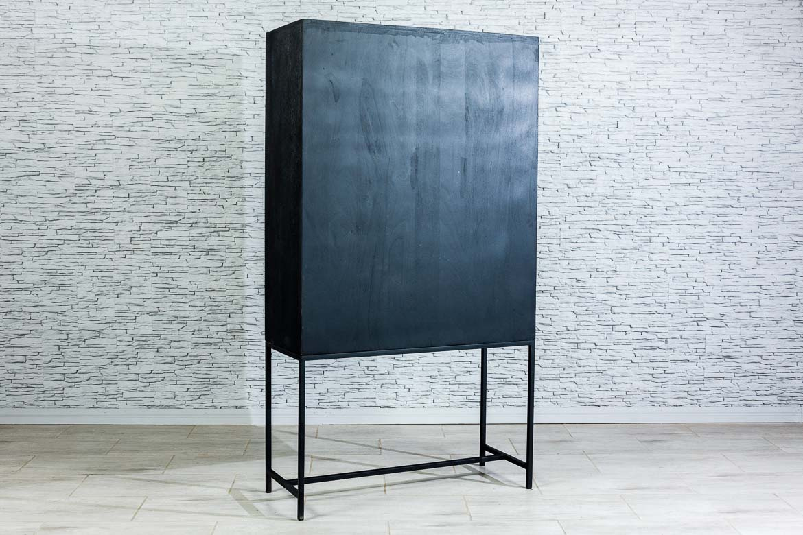Indyjska, czarna szafka na wysokim, żelaznym profilu.