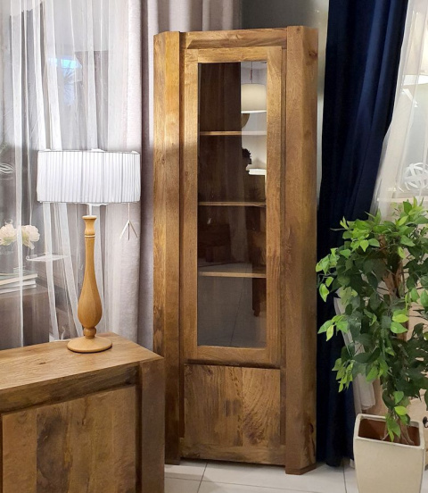 Mebel wykonana w małej manufakturze w Indiach. Do produkcji tego eleganckiego mebla, użyto wysokiej jakości litego drewna mangowca indyjskiego w pięknym odcieniu toffi. Witryna wyposażona w dwie szafki, z czego górna jest przeszklona i posiada drewniane półki. Przeszklenie dodaje meblowi lekkości.