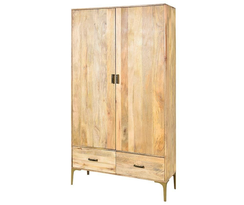 Nowoczesna, wysoka szafa drewniana z serii MODERN LIGHT od Belldeco. Mebel o prostym, minimalistycznym kształcie, uniwersalny wizualnie i łatwy do zaaranżowania. Design wzorowany na stylistyce lat 60-tych. Delikatny, jasny odcień litej deski mangowca, bardzo ładnie komponuje się z wąskimi nóżkami i uchwytami w odcieniu starego złota. W dolnej części szafa posiada dwie pojemne szuflady.