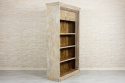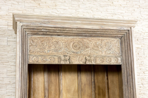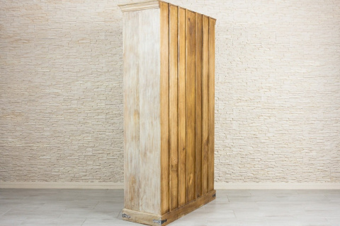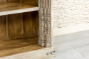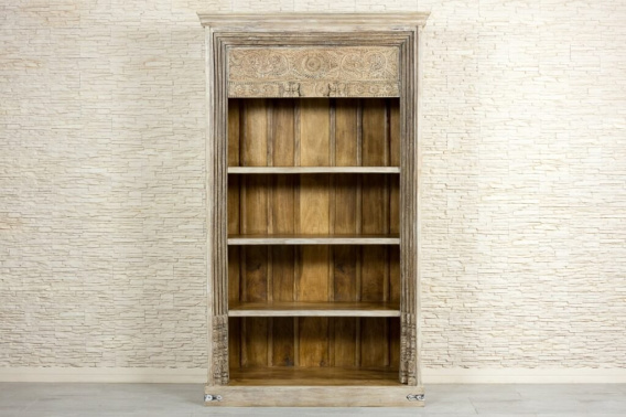 Duży regał indyjski w antycznym stylu. Regał wykonano w całości z drewna, a front ozdobiono dekoracyjnym gzymsem. Wszystkie zdobienia wyrzeźbiono ręcznie. Biblioteka przecierana i delikatnie postarzona. Bielenie pięknie kontrastuje z plecami i półkami z naturalnym odcieniu drewna. Rustykalne okucia w dolnej części są wspaniałym dopełnieniem wysmakowanej całości. Regał posiada głębokie półki, ma których możesz ustawić książki, rami ze zdjęciami bądź inne ozdobne przedmioty. Polecamy do przestronnych wnętrz w stylu orientalnym lub kolonialnym.