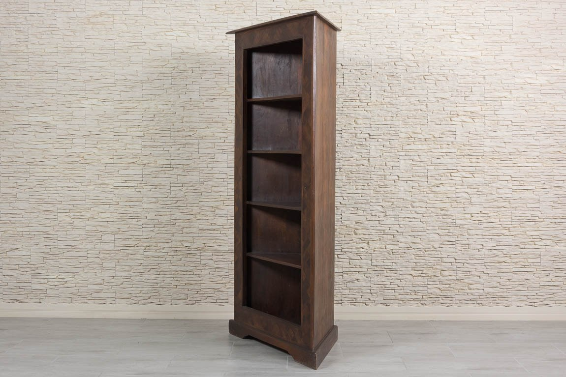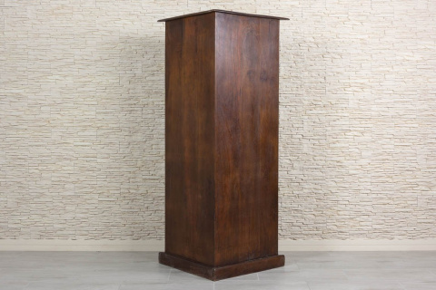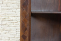 Regał zdobiony na frontach intarsją z kwadratowych kawałków drewna ułożonych w karo. Ten oryginalny mebel wykonany w Indiach z drewna sezamowego, które jest drewnem niezwykle trwałym i odpornym, co daje gwarancję solidności.