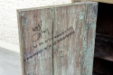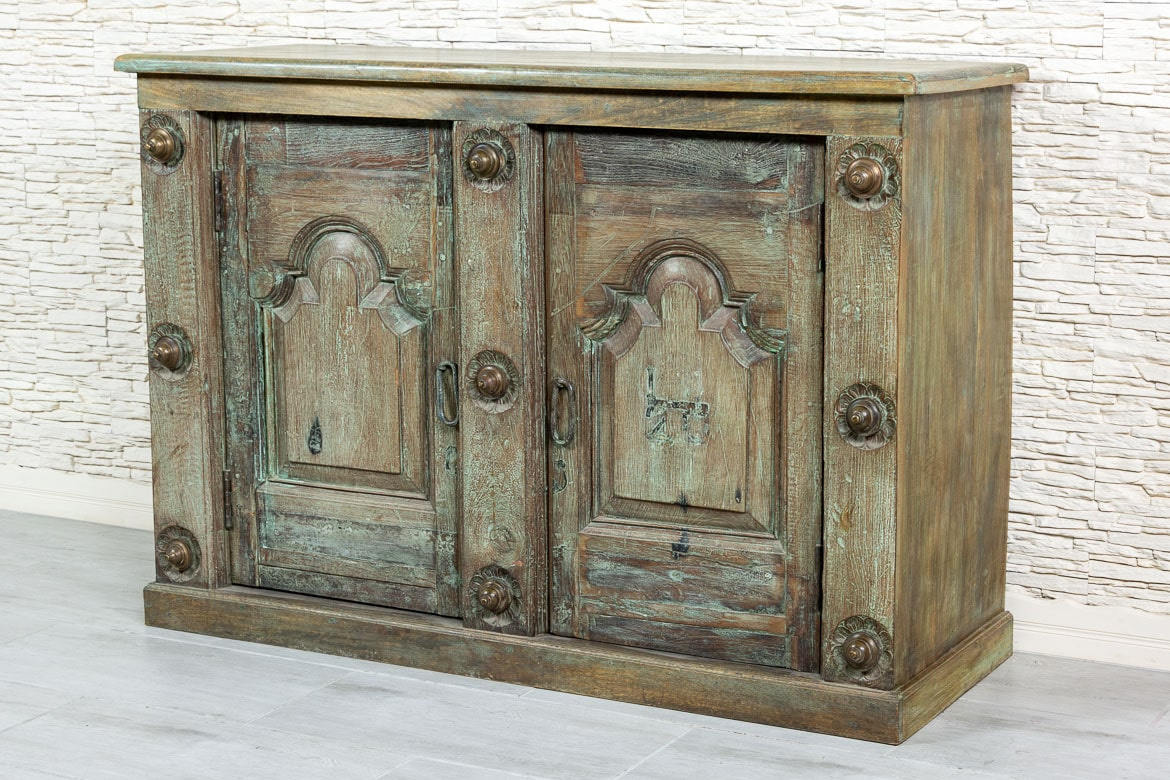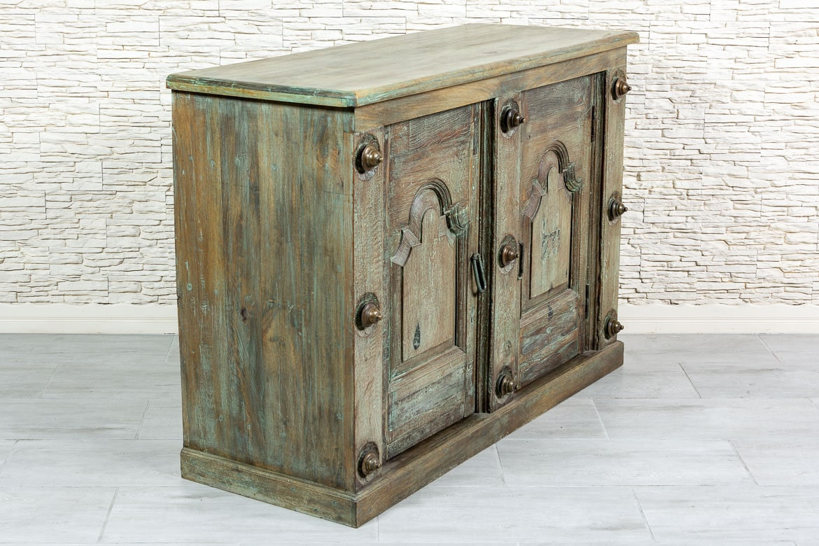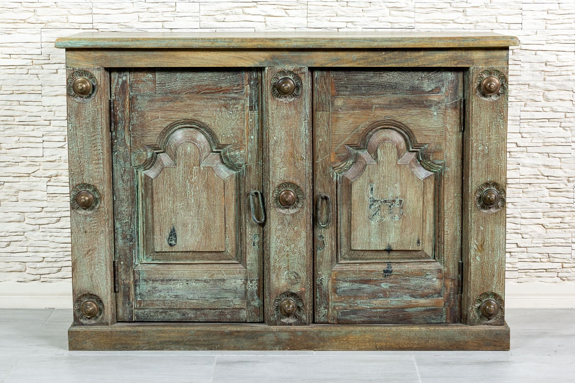 Zielona, przecierana komoda drewniana, wykonana ręcznie w Indiach z teku i starych, odzyskanych drzwi. Posiada duży schowek z półką. Jest niezwykle oryginalna, a zarazem funkcjonalna. Ciężki front ozdobiono dużymi, dekoracyjnymi okuciami. Mebel jest masywny i stabilny. Z pewnością posłuży przez długie lata i nie wyjdzie z mody. Polecamy do wnętrz orientalnych, kolonialnych i country. Mebel sprawdzi się w każdym pomieszczeniu.