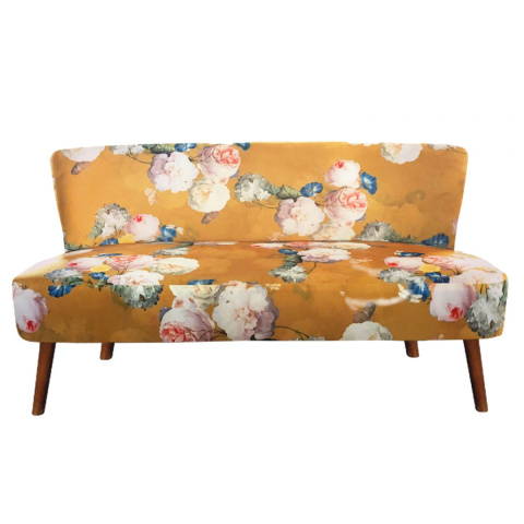 Zjawiskowa mini sofa inspirowana stylem art deco, tapicerowana kwiecistą tkaniną w angielskim stylu.